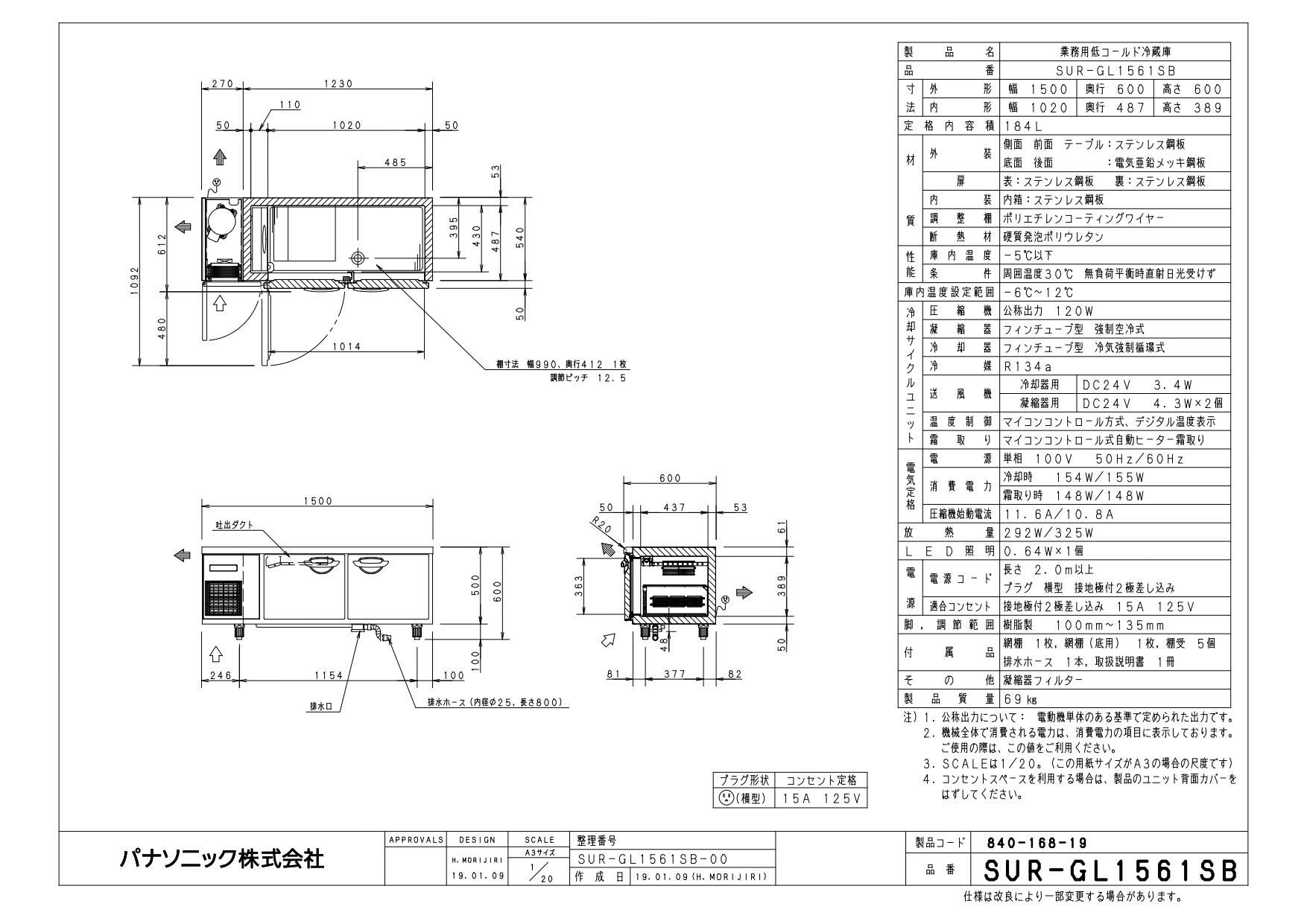 【パナソニック】低コールド冷蔵庫:GBシリーズ SUR-GL1561SB 幅1500×奥行600×高さ600mm 184L 凝縮器フィルター/デジタル温度計 単相100V