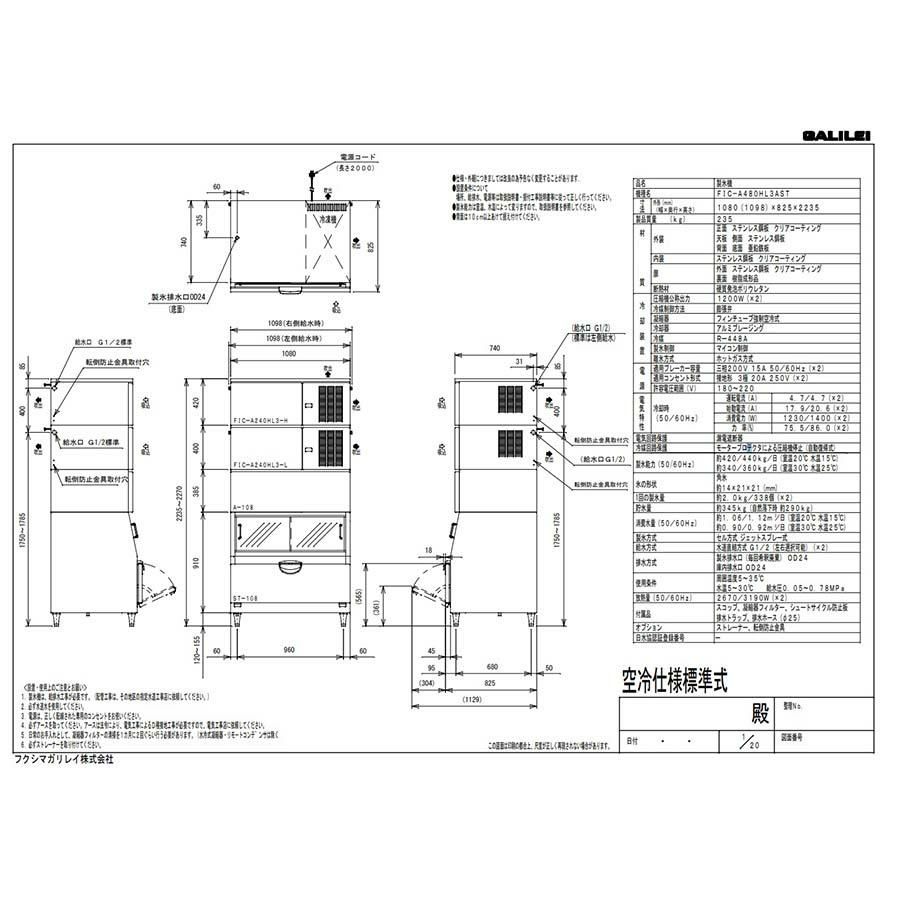 【フクシマガリレイ】製氷機(スタックオンタイプ・ハーフキューブ) FIC-A480HL2AST 幅1080×奥行825×高さ2235