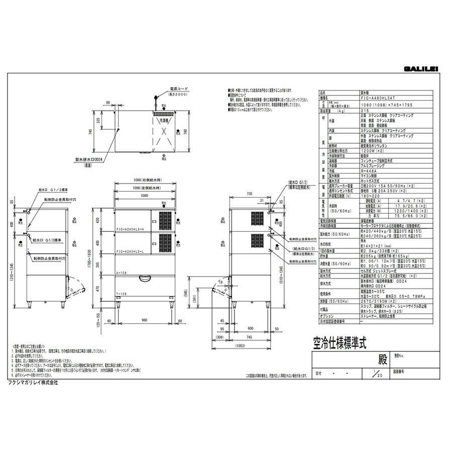 【フクシマガリレイ】製氷機(スタックオンタイプ・ハーフキューブ) FIC-A480HL2AT 幅1080×奥行745×高さ1795