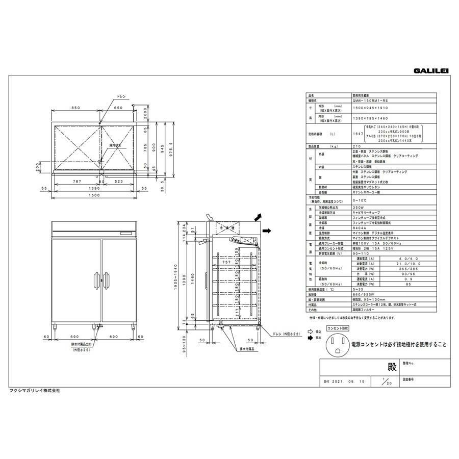 【フクシマガリレイ】縦型牛乳冷蔵庫 GMW-150RM-RS(旧型式:UMW-150RM6-RS) 幅1500×奥行945×高さ1910