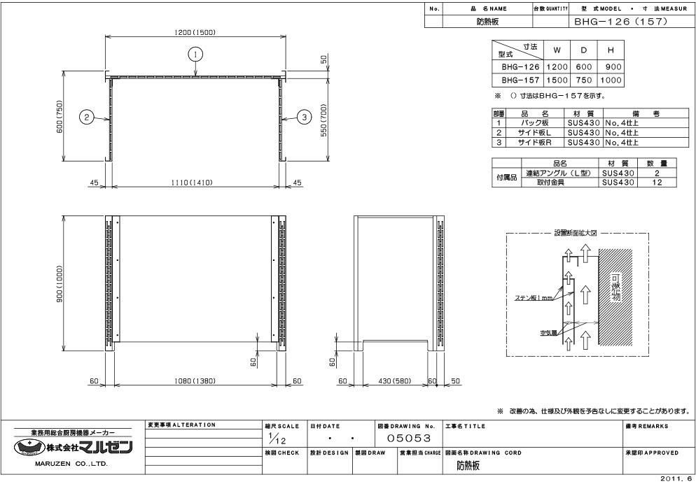 【マルゼン】防熱板 三方ガード BHG-126 幅1200×奥行600×高さ900mm