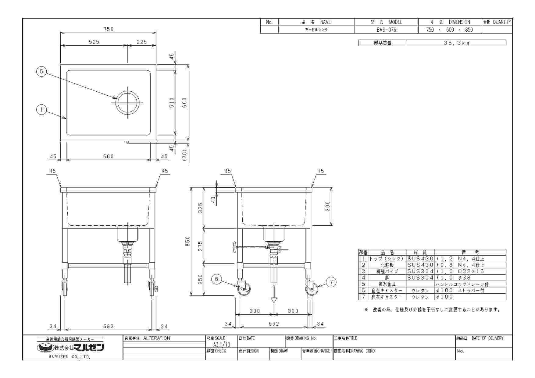 【3月末までのお届け分限定価格】【マルゼン】モービルシンク BMS-076 幅750×奥行600×高さ850mm