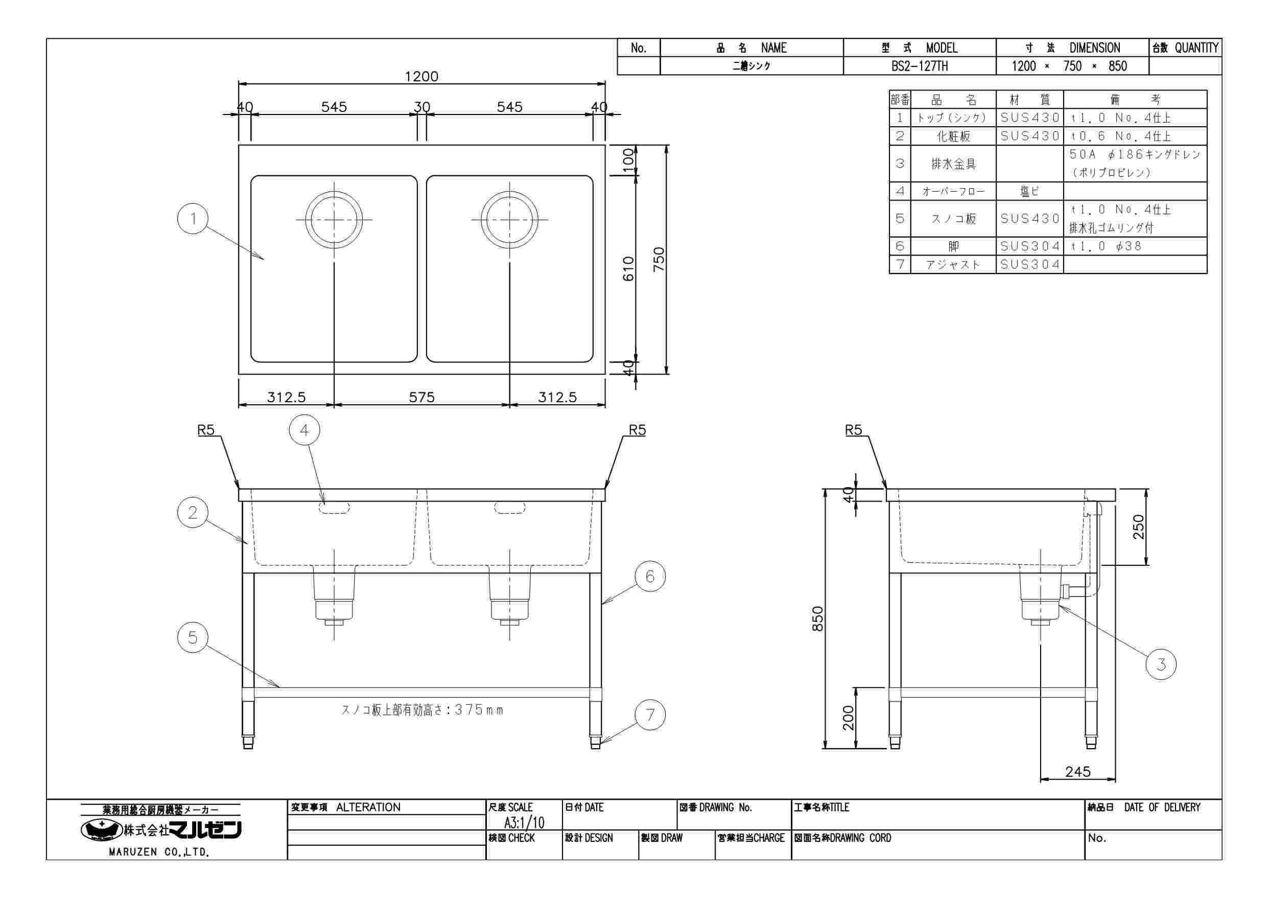 商品名:二槽シンク バックガードなし 三面アール W1200×D750×H850