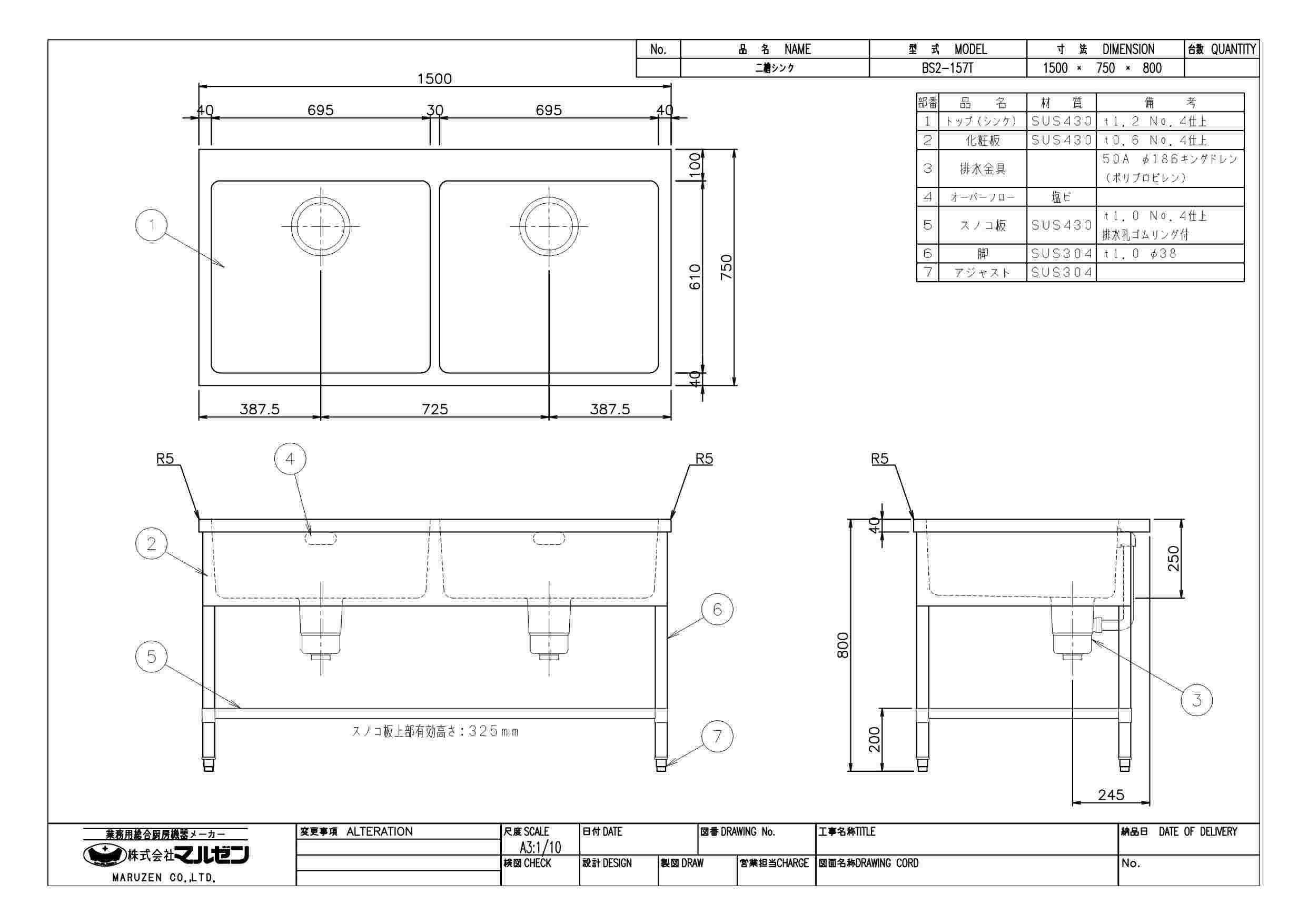 商品名:二槽シンク バックガードなし 三面アール W1500×D750×H800