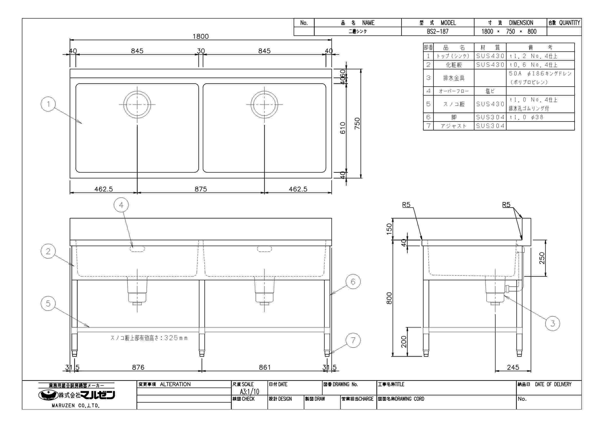 商品名:二槽シンク W1800×D750×H800