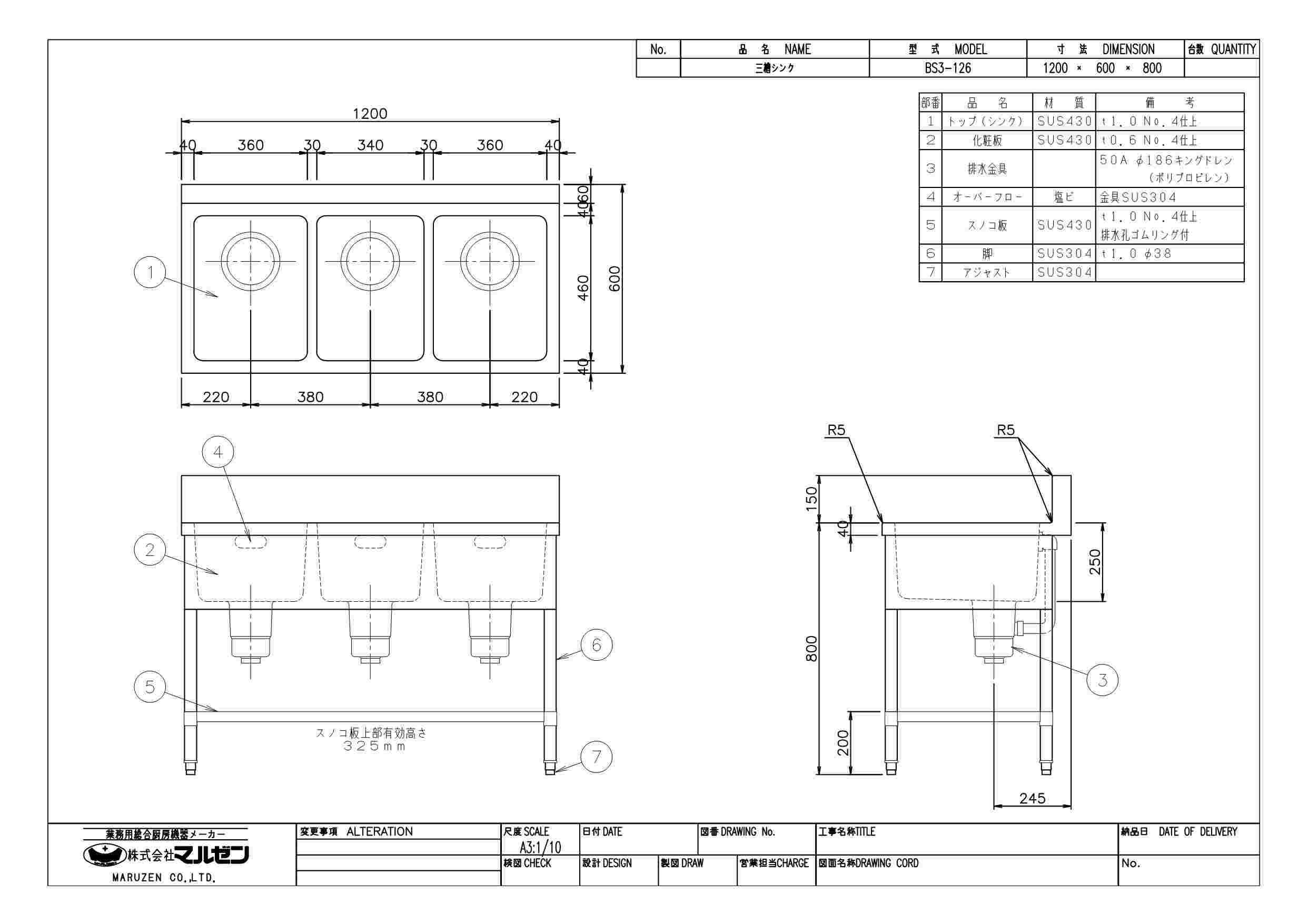 【3月末までのお届け分限定価格】【マルゼン】三槽シンク バックガードあり BS3-126 幅1200×奥行600×高さ800mm