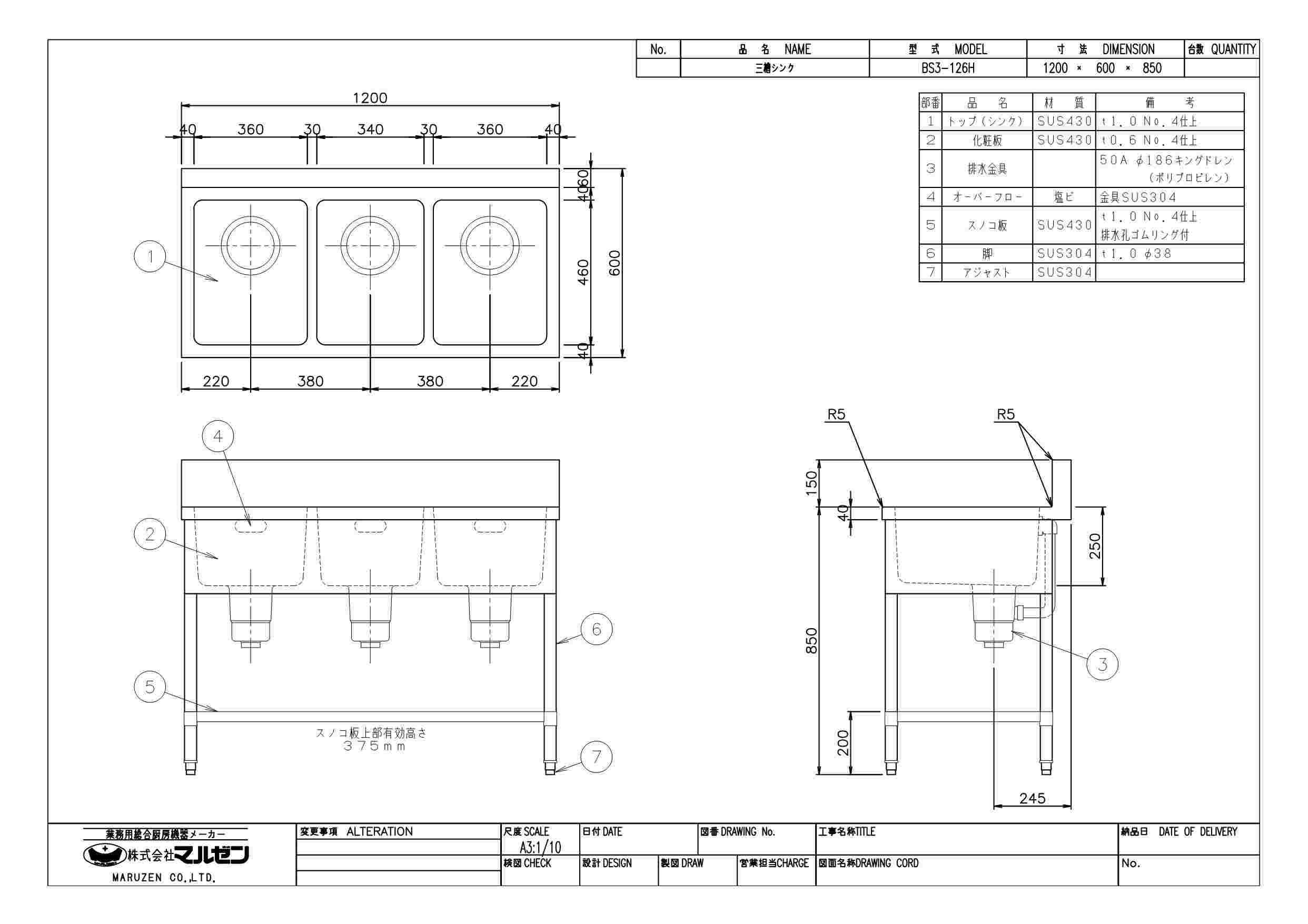 商品名:三槽シンク W1200×D600×H850
