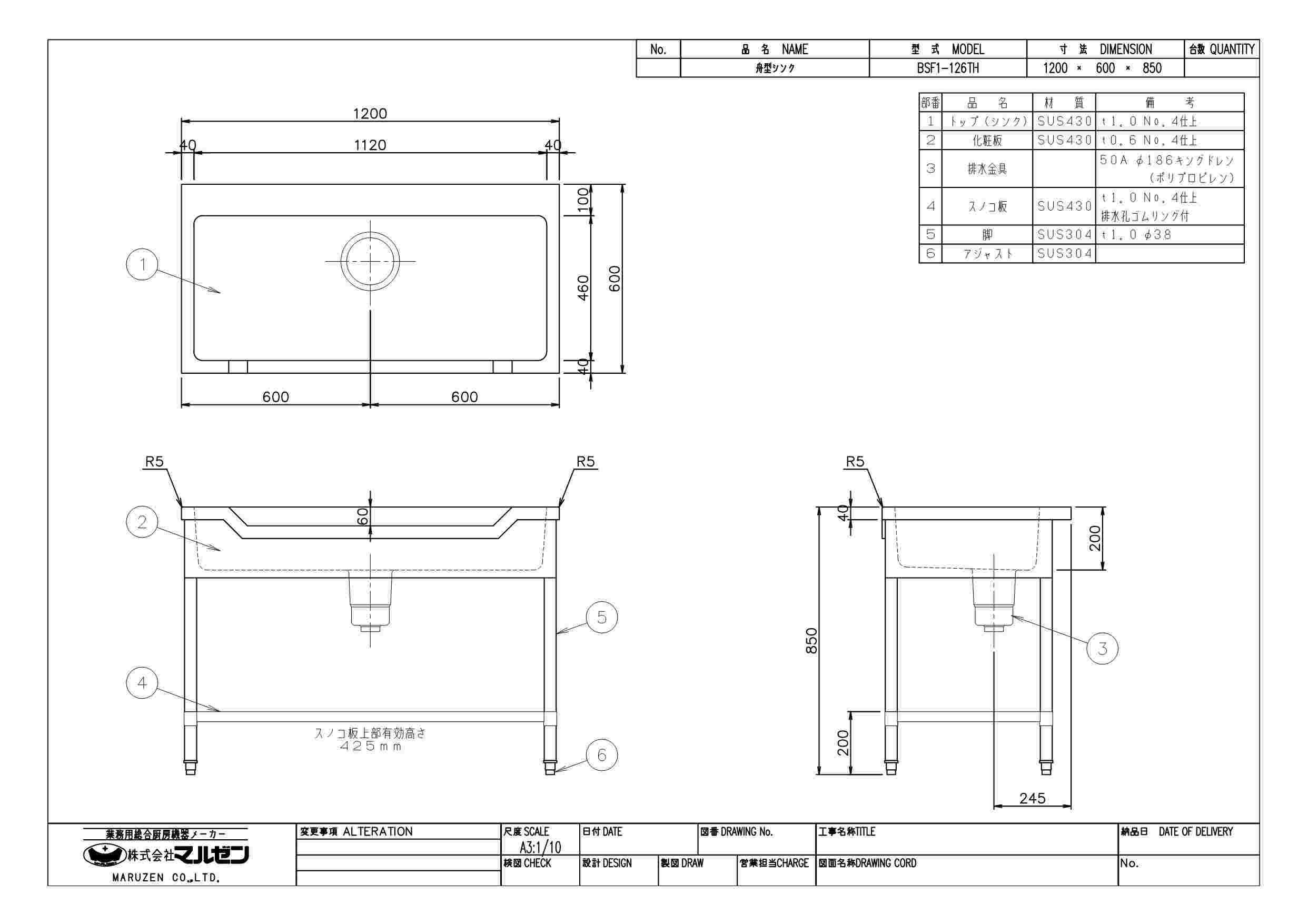 【3月末までのお届け分限定価格】BSF1-126TH【マルゼン】舟形シンク バックガードなし 三面アール 幅1200×奥行600×高さ850mm