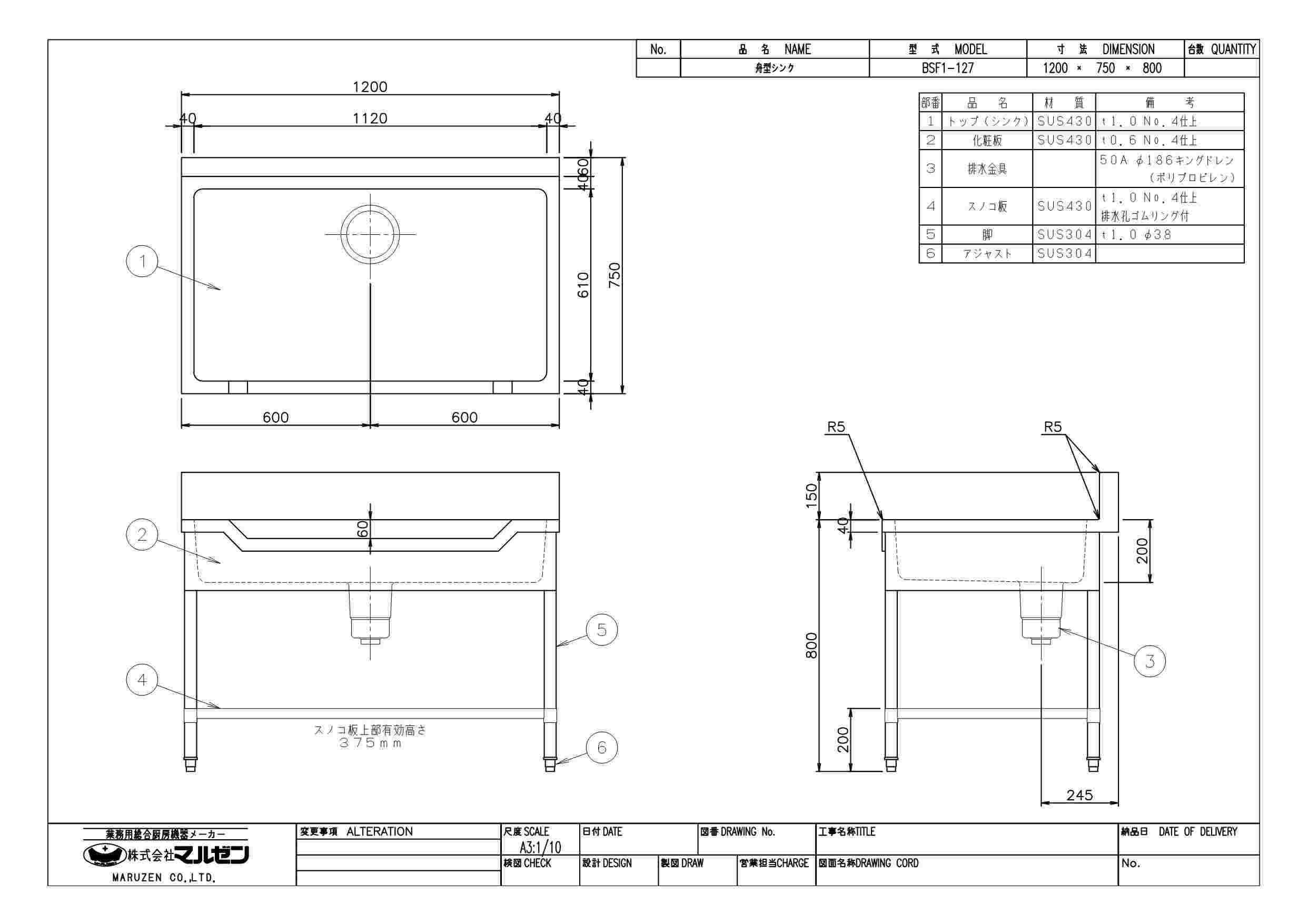 【3月末までのお届け分限定価格】【マルゼン】舟形シンク BSF1-127 幅1200×奥行750×高さ800mm