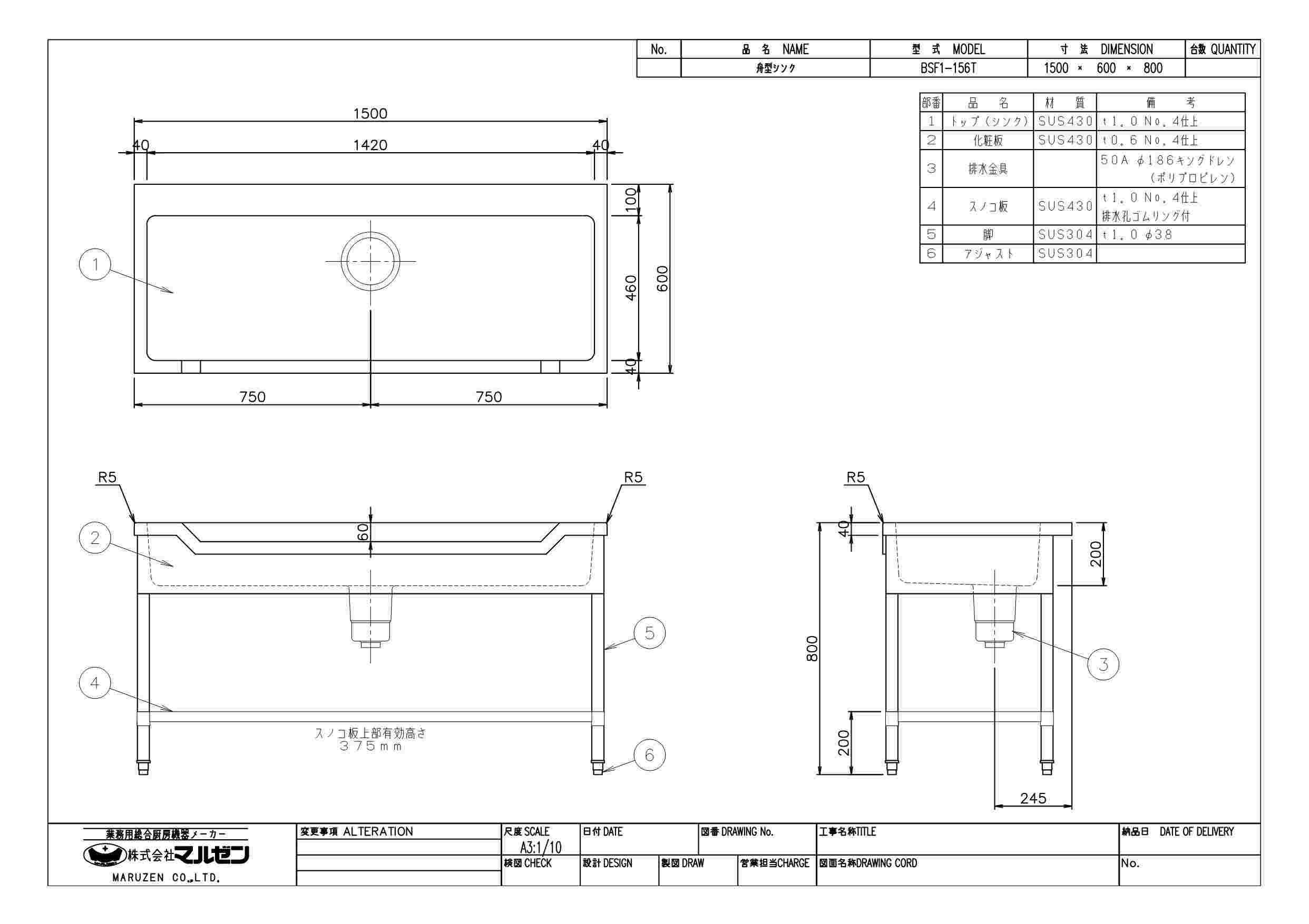 【3月末までのお届け分限定価格】【マルゼン】舟形シンク バックガードなし 三面アール BSF1-156T 幅1500×奥行600×高さ800mm