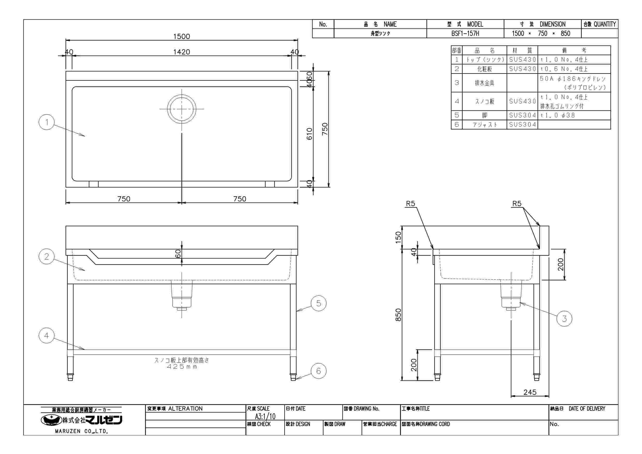 商品名:舟形シンク バックガード有 三面アール W1500×D750×H850
