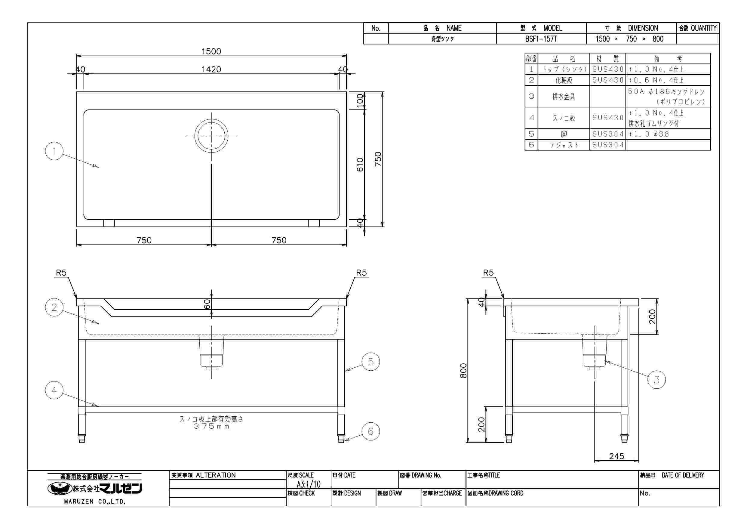 【3月末までのお届け分限定価格】【マルゼン】舟形シンク バックガードなし 三面アール BSF1-157T 幅1500×奥行750×高さ800mm