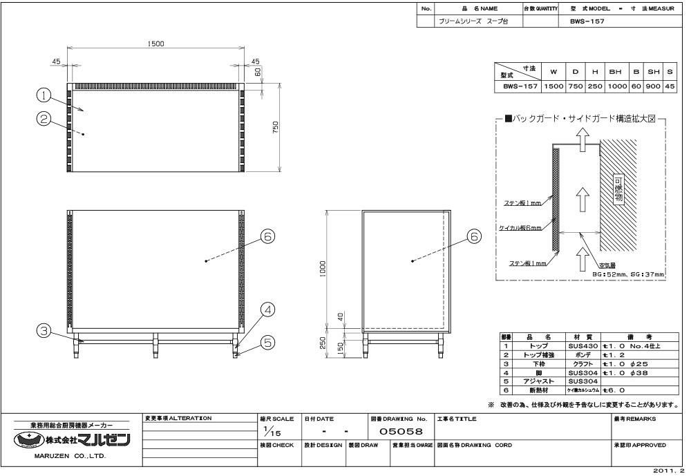 【3月末までのお届け分限定価格】BWS-157 【マルゼン】スープ台(三方バックガード) 幅1500×奥行750×高さ250mm