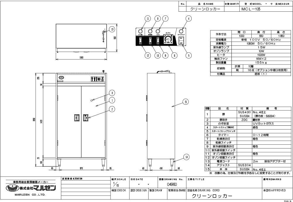 【マルゼン】クリーンロッカー MCL-105 幅1000×奥行550×高さ1850 単相 100V 50/60Hz