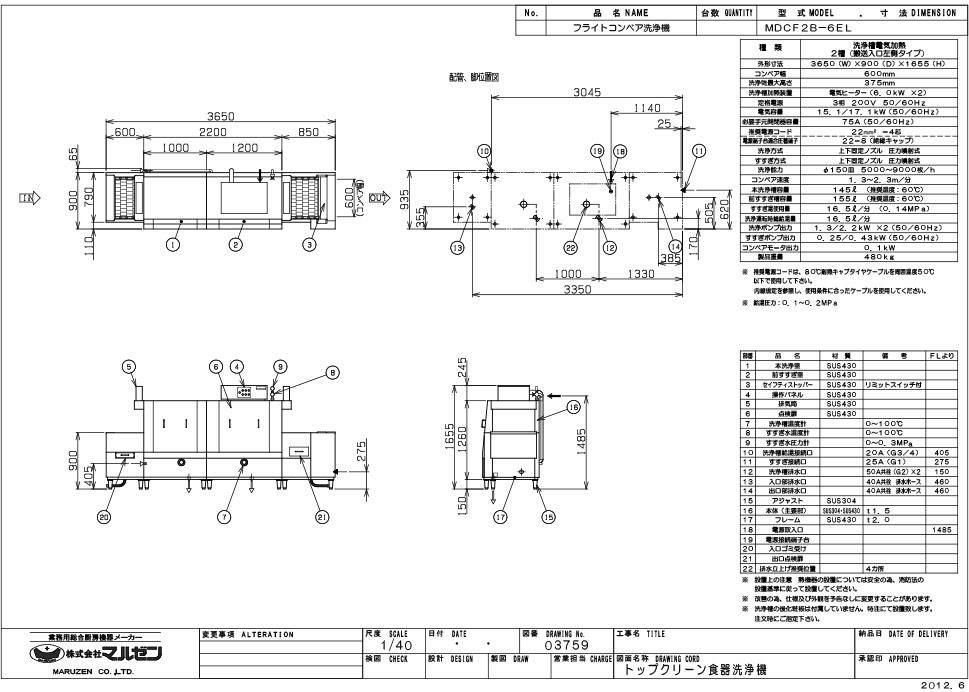 MDCF2B-6EL 【マルゼン】フライトコンベア洗浄機 幅3650×奥行900×高さ1655 三相200V 50/60Hz