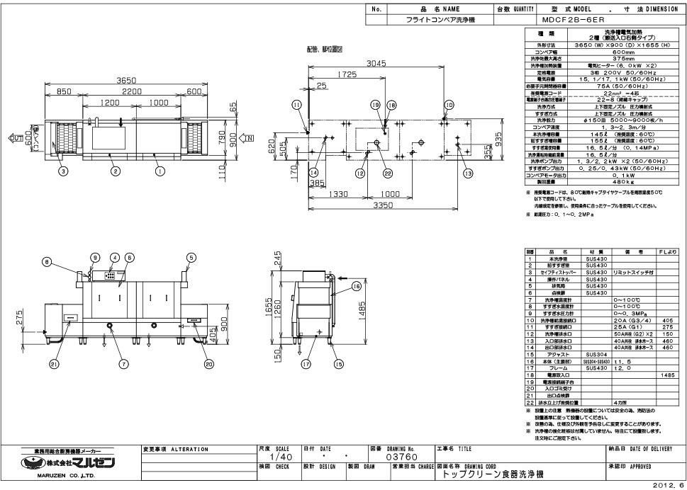 MDCF2B-6ER 【マルゼン】フライトコンベア洗浄機 幅3650×奥行900×高さ1655 三相200V 50/60Hz