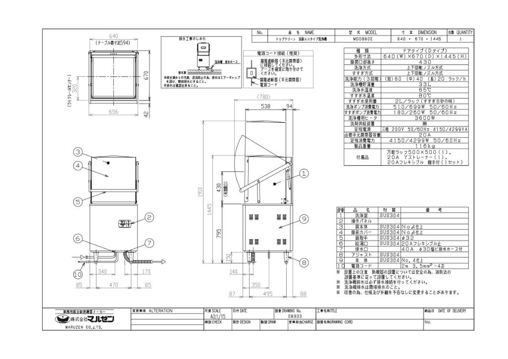 MDDB8CE 【マルゼン】涼厨食器洗浄機 エコタイプ 幅640×奥行670×高さ1445 三相200V