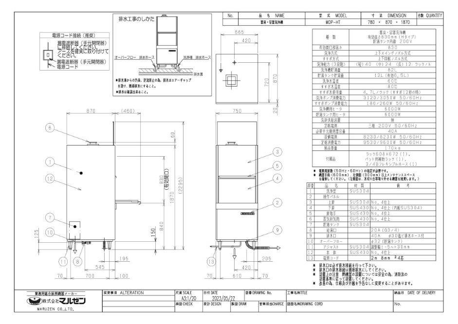 MDP-HT 【マルゼン】器具・容器洗浄機 幅750×奥行870×高さ1870 三相 200V 50/60Hz