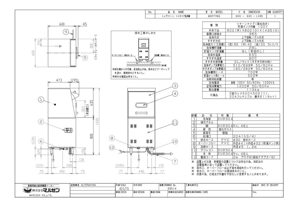 MDRTR8E 【マルゼン】食器洗浄機 エコタイプ 右開き 幅600×奥行600×高さ1435 1P100V