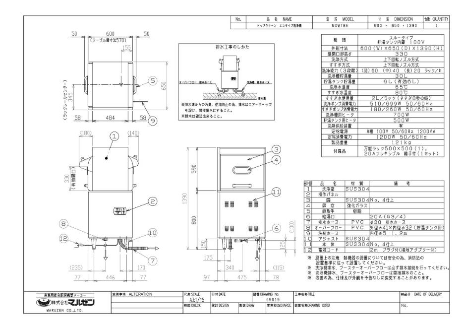 洗浄ポンプ消費電力:510/699W 50/60Hz