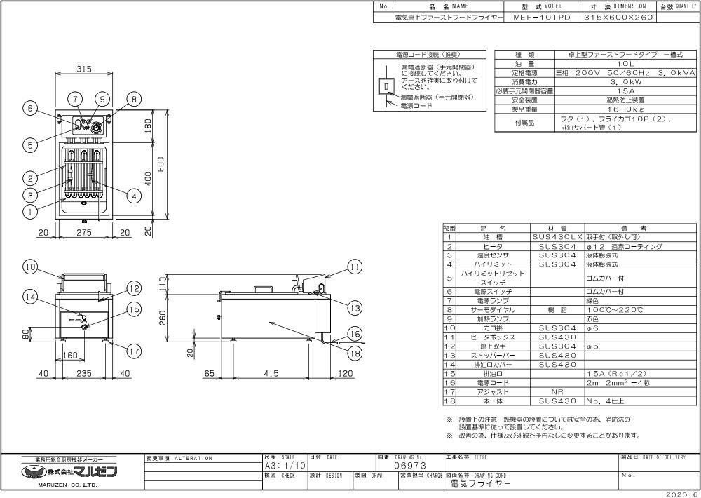MEF-10TPD 【マルゼン】 電気フライヤー 10L 卓上ファーストフードタイプ 幅315×奥行600×高さ260