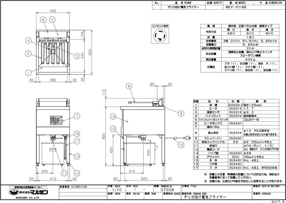 MEF-D18B 【マルゼン】 電気フライヤー デリカ向け 三相200V 幅450×奥行600×高さ800