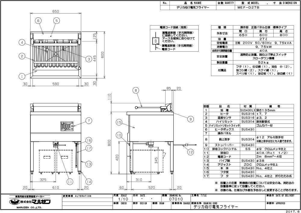 MEF-D27B 【マルゼン】 電気フライヤー デリカ向け 三相200V 幅650×奥行600×高さ800