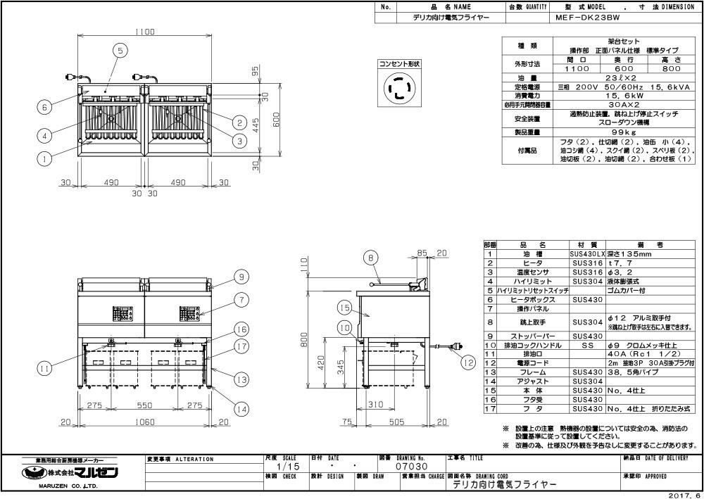 MEF-DK23BW 【マルゼン】 電気フライヤー デリカ向け 三相200V 幅1100×奥行600×高さ800