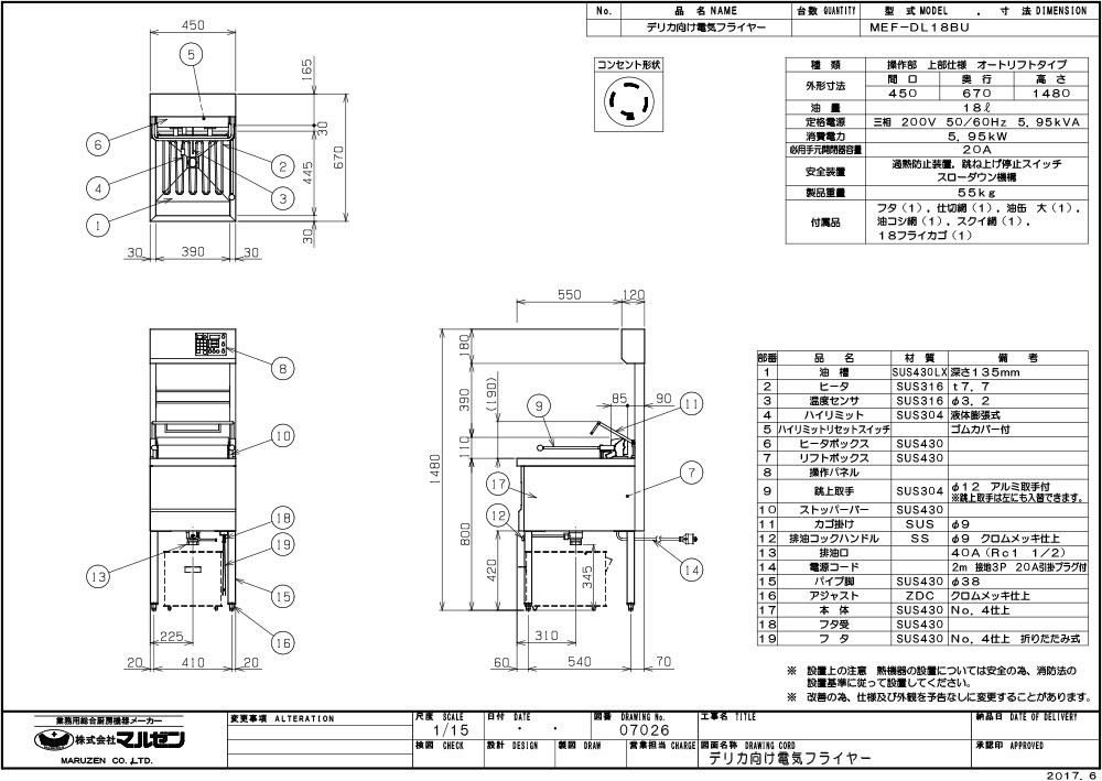 MEF-DL18BU 【マルゼン】 電気フライヤー デリカ向け 三相200V 幅450×奥行670×高さ1480