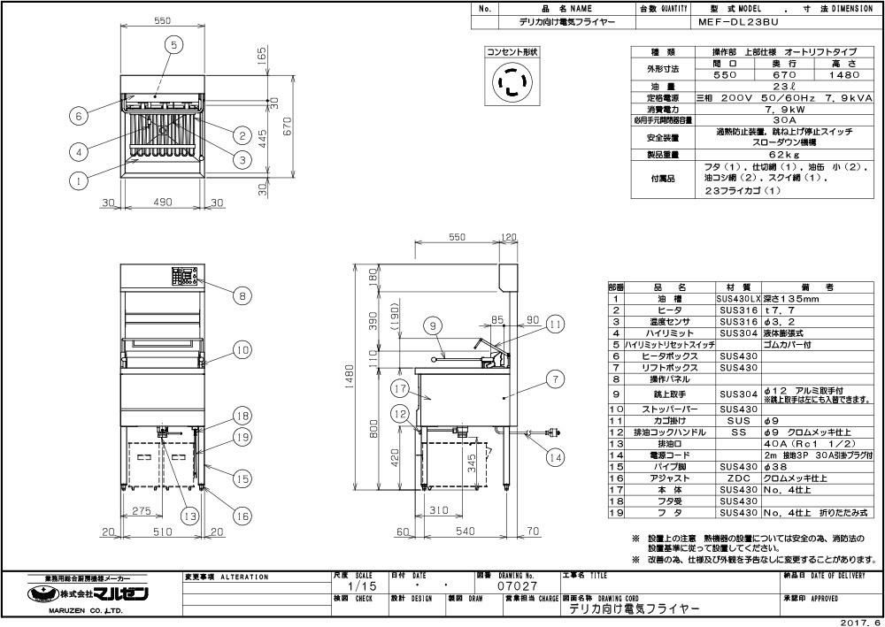 MEF-DL23BU 【マルゼン】 電気フライヤー デリカ向け 三相200V 幅550×奥行670×高さ1480
