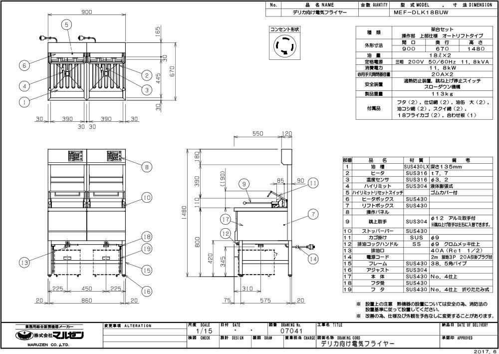 MEF-DLK18BUW 【マルゼン】 電気フライヤー デリカ向け 三相200V 幅900×奥行670×高さ1480