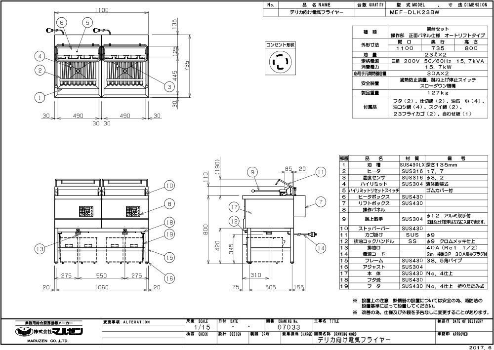 MEF-DLK23BW 【マルゼン】 電気フライヤー デリカ向け 三相200V 幅1100×奥行735×高さ800