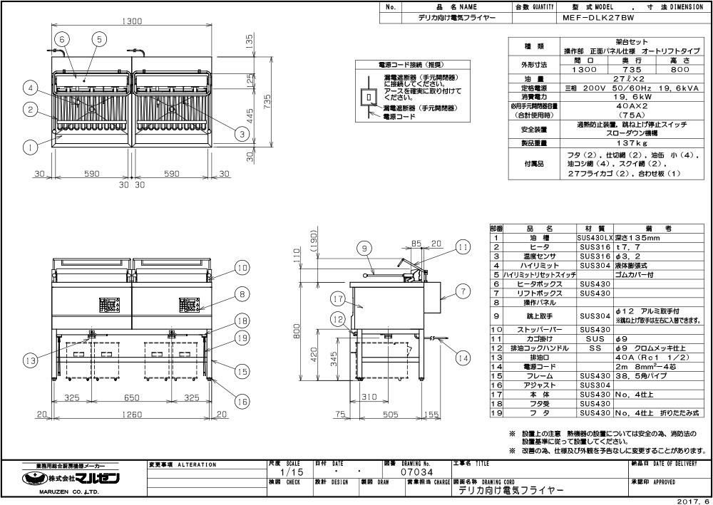 MEF-DLK27BW 【マルゼン】 電気フライヤー デリカ向け 三相200V 幅1300×奥行735×高さ800