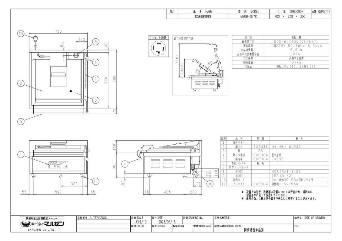 【マルゼン】電気多目的焼物器 MEGM-077C 幅700×奥行700×高さ300 三相200V