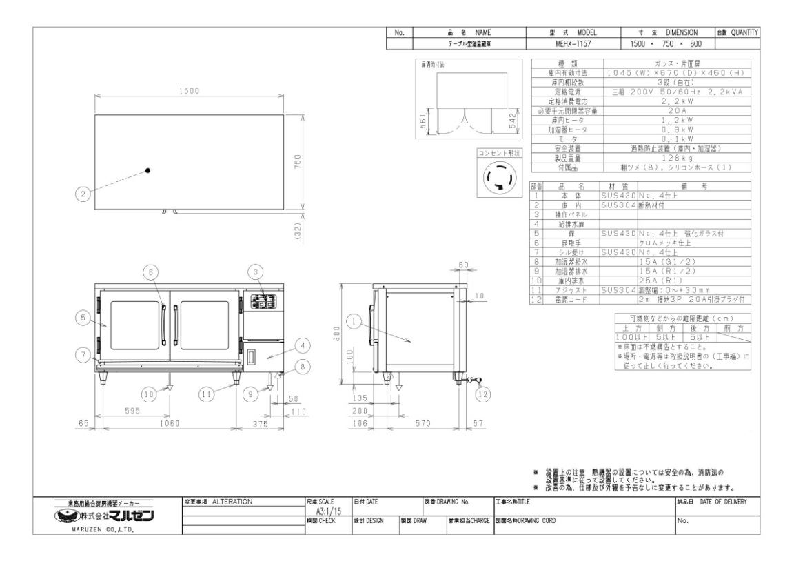 【マルゼン】湿温蔵庫 テーブルタイプ MEHX-T157 幅1500×奥行750×高さ800