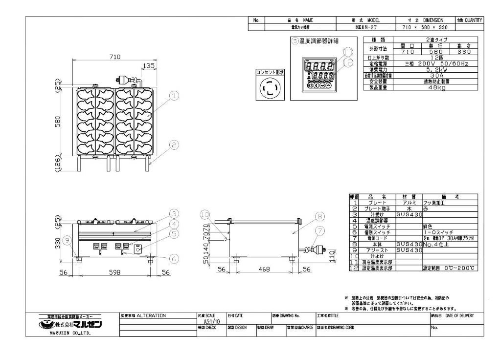 【マルゼン】電気たい焼器 MEKN-2T 幅710×奥行580×高さ330 三相200V 50/60Hz