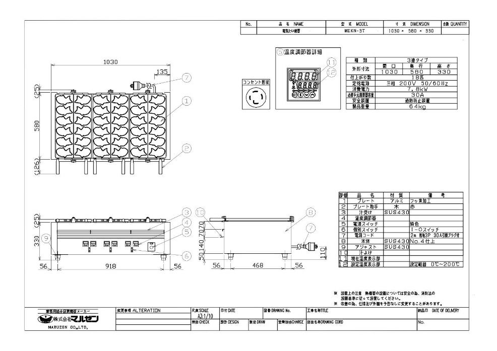 【マルゼン】電気たい焼器 MEKN-3T 幅1030×奥行580×高さ330 三相200V 50/60Hz