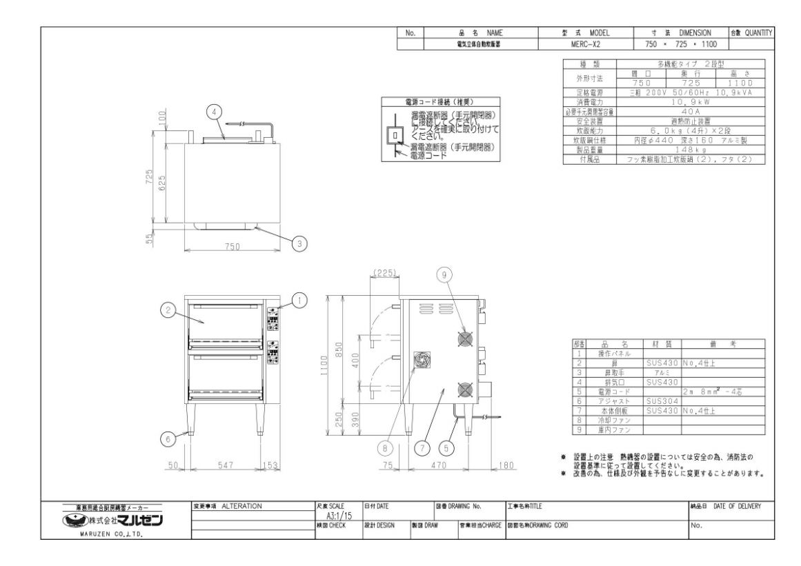 MERC-X2 【マルゼン】電気立体自動炊飯器 幅750×奥行725×高さ1100 三相200V 50/60Hz 10.9kw