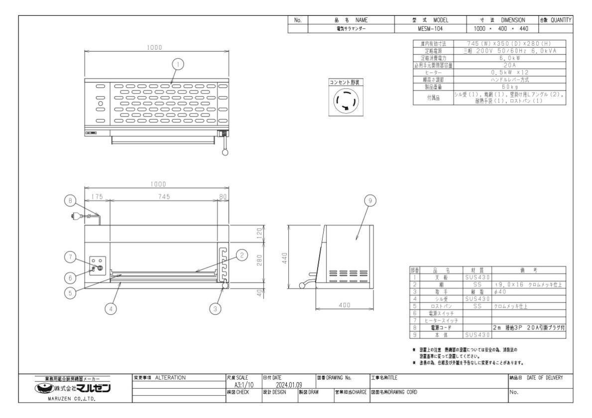 【マルゼン】電気サラマンダー 電気焼物器 MESM-104 幅1000×奥行400×高さ440mm