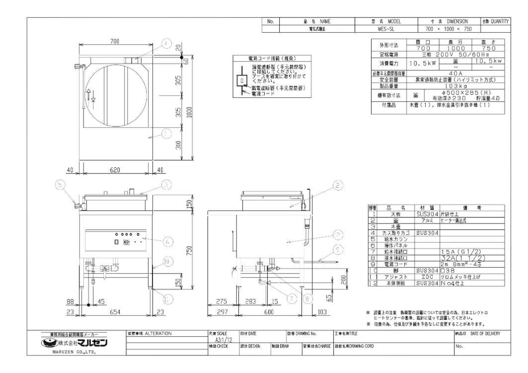 【マルゼン】電気式うどん・そば釜 丸釜タイプ MES-SL 幅700×奥行1000×高さ750mm