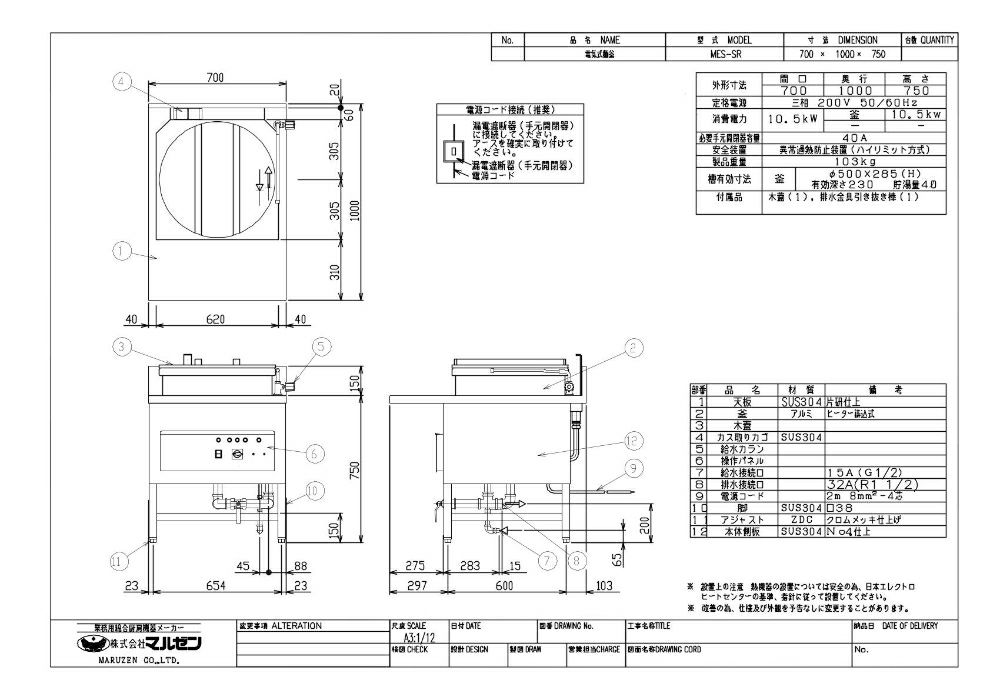 【マルゼン】電気式うどん・そば釜 丸釜タイプ MES-SR 幅700×奥行1000×高さ750mm