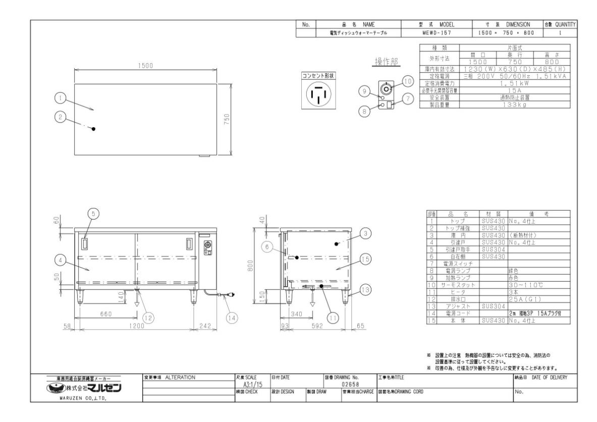 外形寸法:幅1500×奥行750×高さ800(mm)