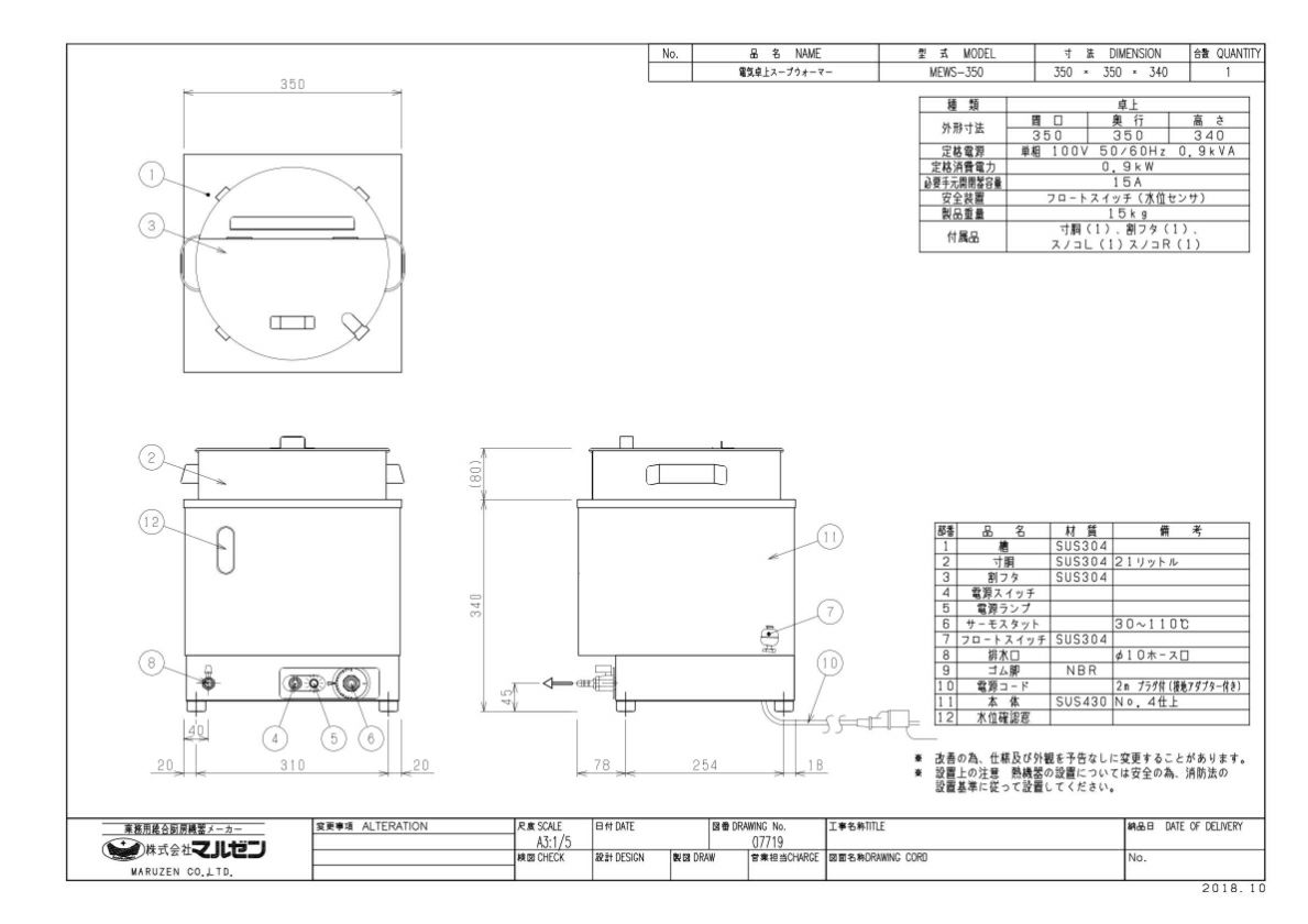 【マルゼン】電気スープウォーマー MEWS-350 幅350×奥行350×高さ340mm