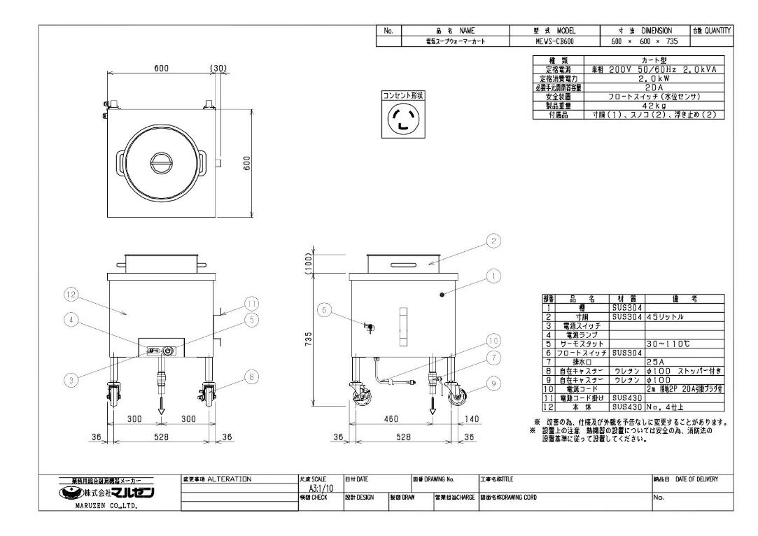 【マルゼン】電気スープウォーマー MEWS-CB600 幅600×奥行600×高さ735mm