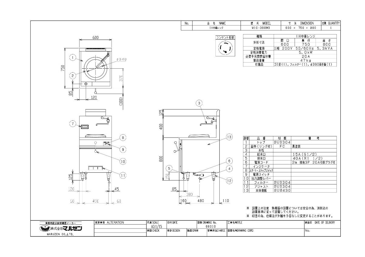 【マルゼン】IH中華レンジ MIC-390WB 幅600×奥行750×高さ800 三相200V