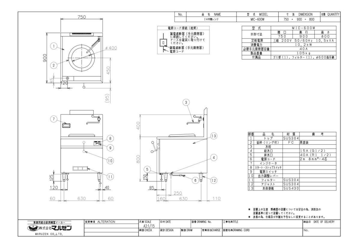 【マルゼン】IH中華レンジ MIC-600W 幅750×奥行900×高さ800 三相200V