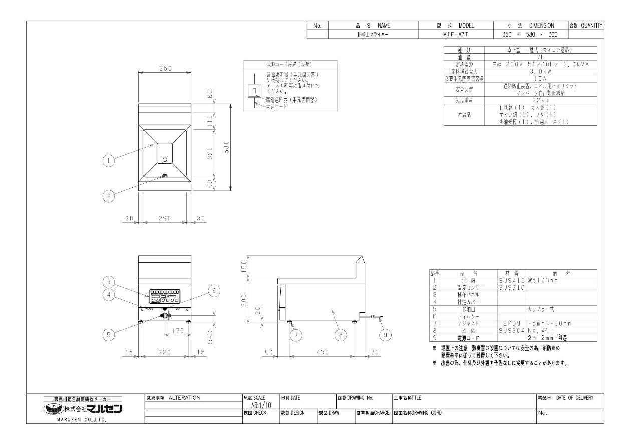 MIF-A7T 【マルゼン】 IH卓上フライヤー 7L 幅350×奥行580×高さ300