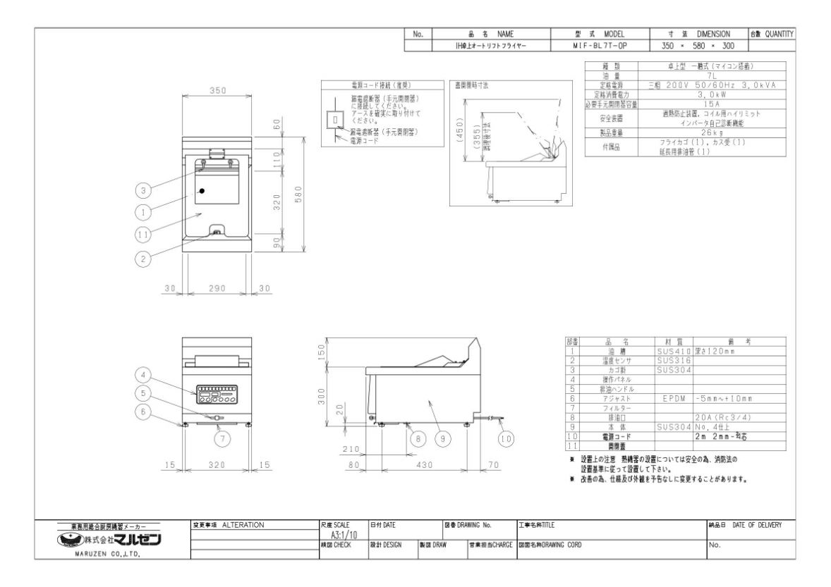 MIF-BL7T-OP 【マルゼン】 IH卓上フライヤー 三相200V 幅350×奥行580×高さ300