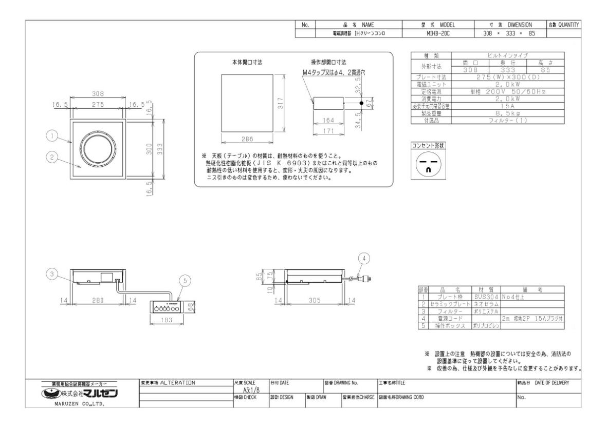 MIHB-20C 【マルゼン】IHクリーンコンロ ビルトインタイプ 幅308×奥行333×高さ85 単相200V