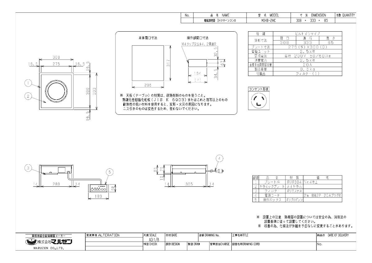 MIHB-2HC 【マルゼン】IHクリーンコンロ ビルトインタイプ 幅308×奥行333×高さ85 単相200V